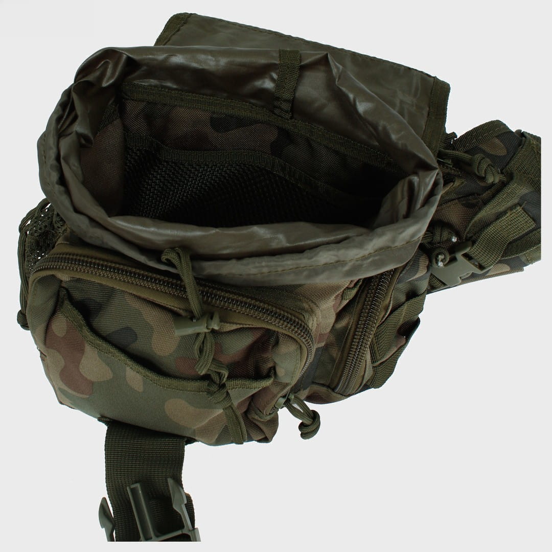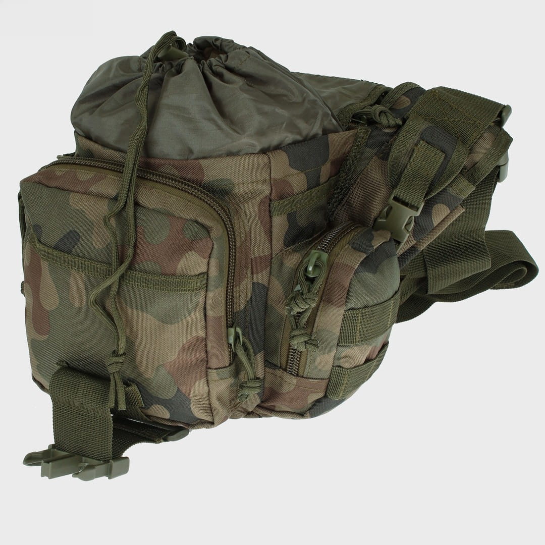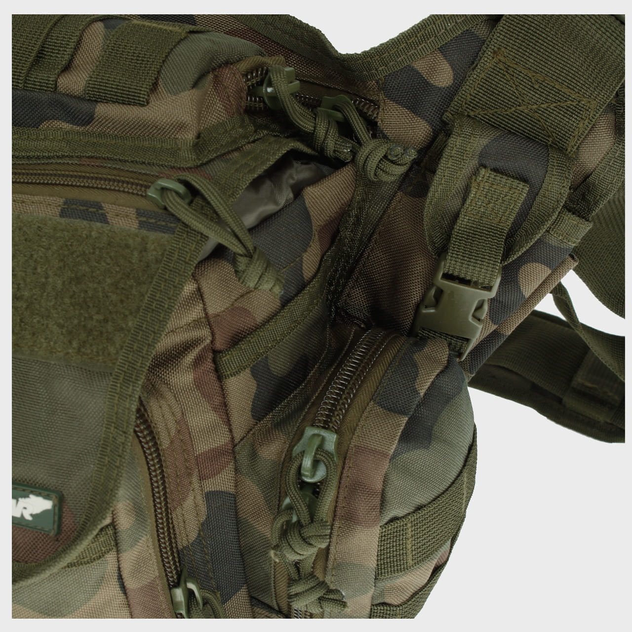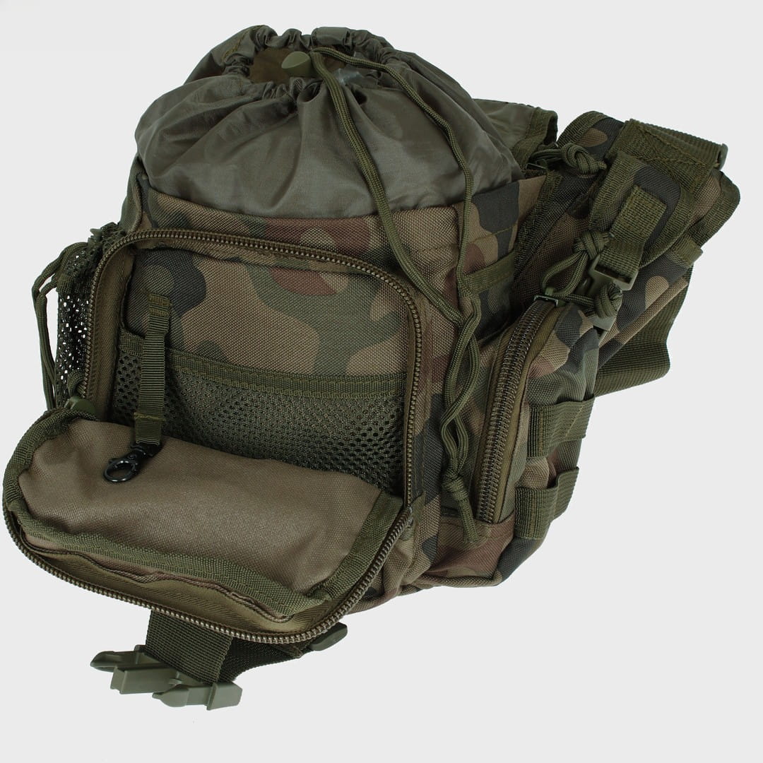 Torba wyposażona w taśmy w systemie Molle – umożliwiające podczepienie dodatkowej kieszeni, radia, ładownic lub telefonu.