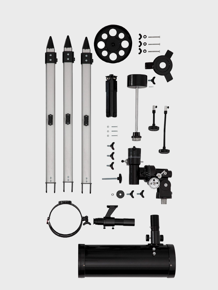 W komplecie znajdują się okulary, soczewka Barlowa, filtr księżycowy oraz mapy nieba i Układu Słonecznego.