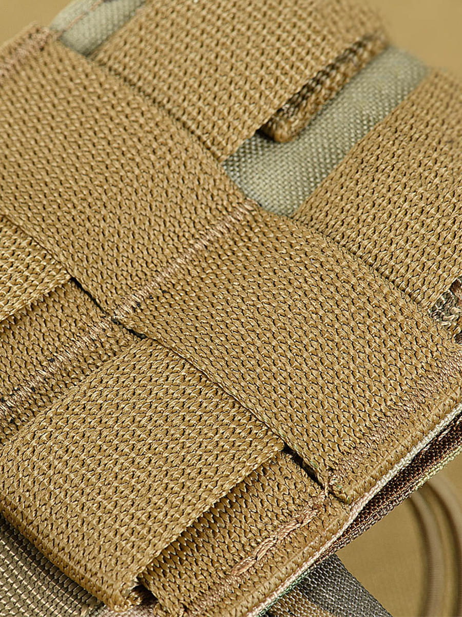 Taśmy systemu Molle umożliwiają mocowanie do pasa, kamizelki taktycznej czy plecaka. Taśmy frontowe pozwalają na łączenie zasobników ze sobą.