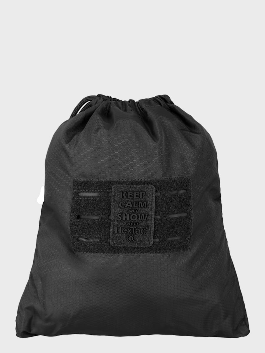 Worek posiada z przodu laserowo wycięty panel montażowy z miękkiego rzepu, a na nim naszywkę z napisem: "Keep Calm And Show Your HexTac".