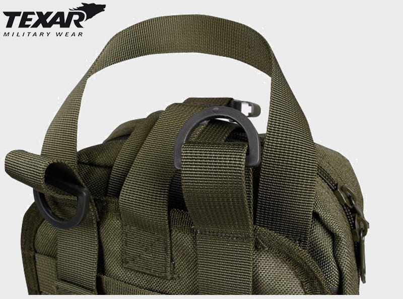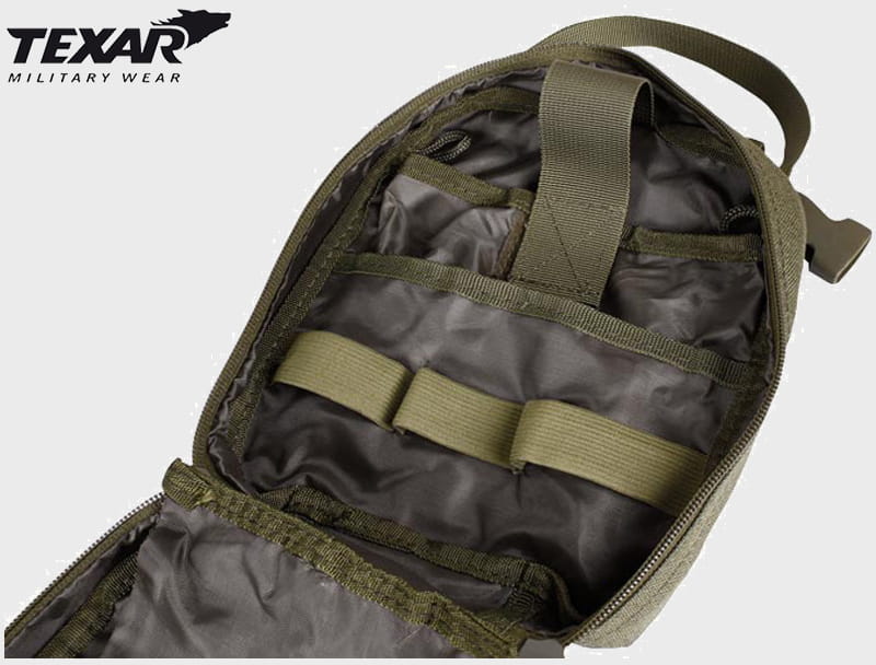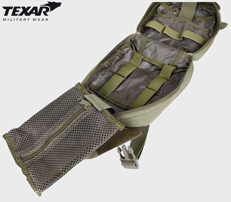 Pojemna komora ładunkowa pozwoli na spakowanie np. zestawu opatrunkowego, leków. Kieszeń rozpinana na całej wysokości, po otwarciu uzyskujemy łatwy i szybki dostęp do pełnej zawartości. System wewnętrznych taśm elastycznych daje bardzo dużą dowolność w organizacji przedmiotów. Gumy o różnej wielkości, doskonałe na rękawiczki, strzykawki lub bandaże.