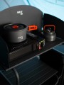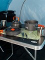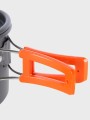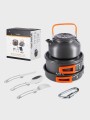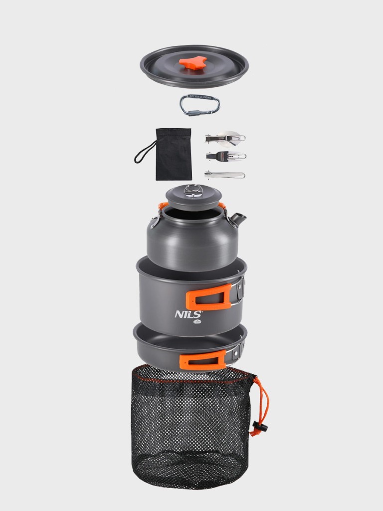 - Kompletny zestaw: garnek, patelnia, czajnik i składane sztućce – wszystko, co potrzebne do gotowania w terenie.